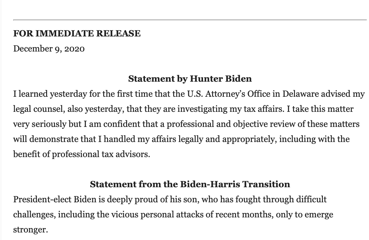 Statement from Biden-Harris transition says Pres.-elect Biden is "deeply proud of his son," and says he's emerged stronger after fighting "vicious personal attacks."